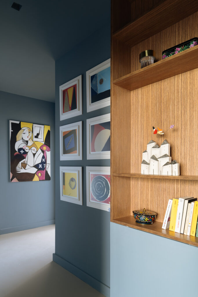 Il blu, in dialogo con il mare, attraversa le stanze come un filo conduttore. I quadri, presenze forti, hanno